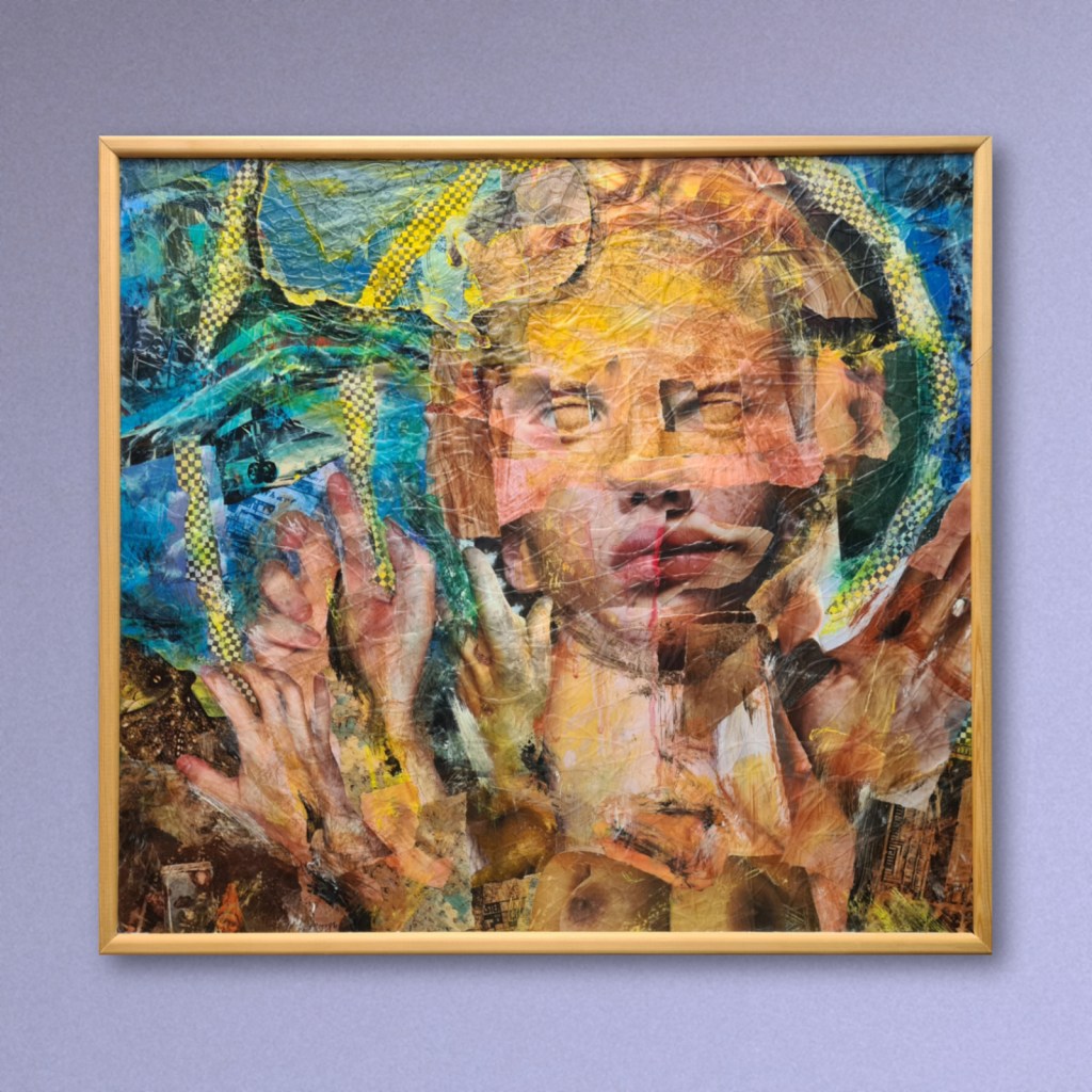 Original paper collage with acrylic ink on MDF panel. The last survivor of a series of seven, all worked and reworked until dead. However this one looked suitably angelic, a grim cupid, so it survives for now. I wouldn’t hold your breath or anything.