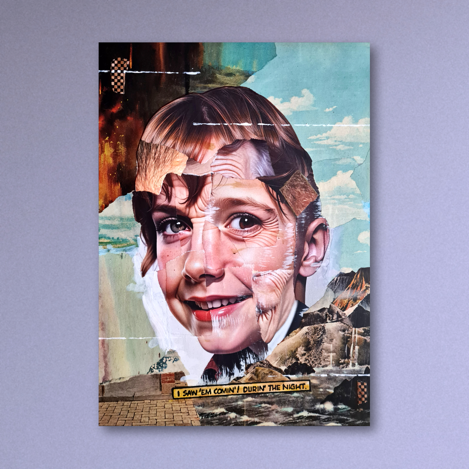 Original paper collage with acrylic paint on a wood panel. A mix of sources from vintage magazines and a certain photograph filtered through a generative art process. It is likely that it was stopped before it was finished, A lession learned no doubt.