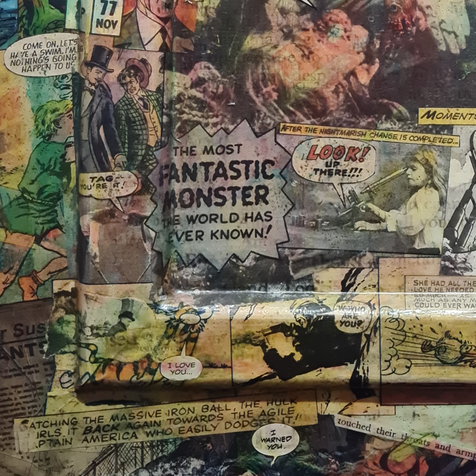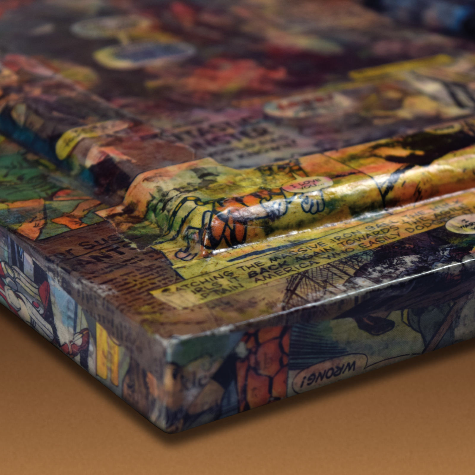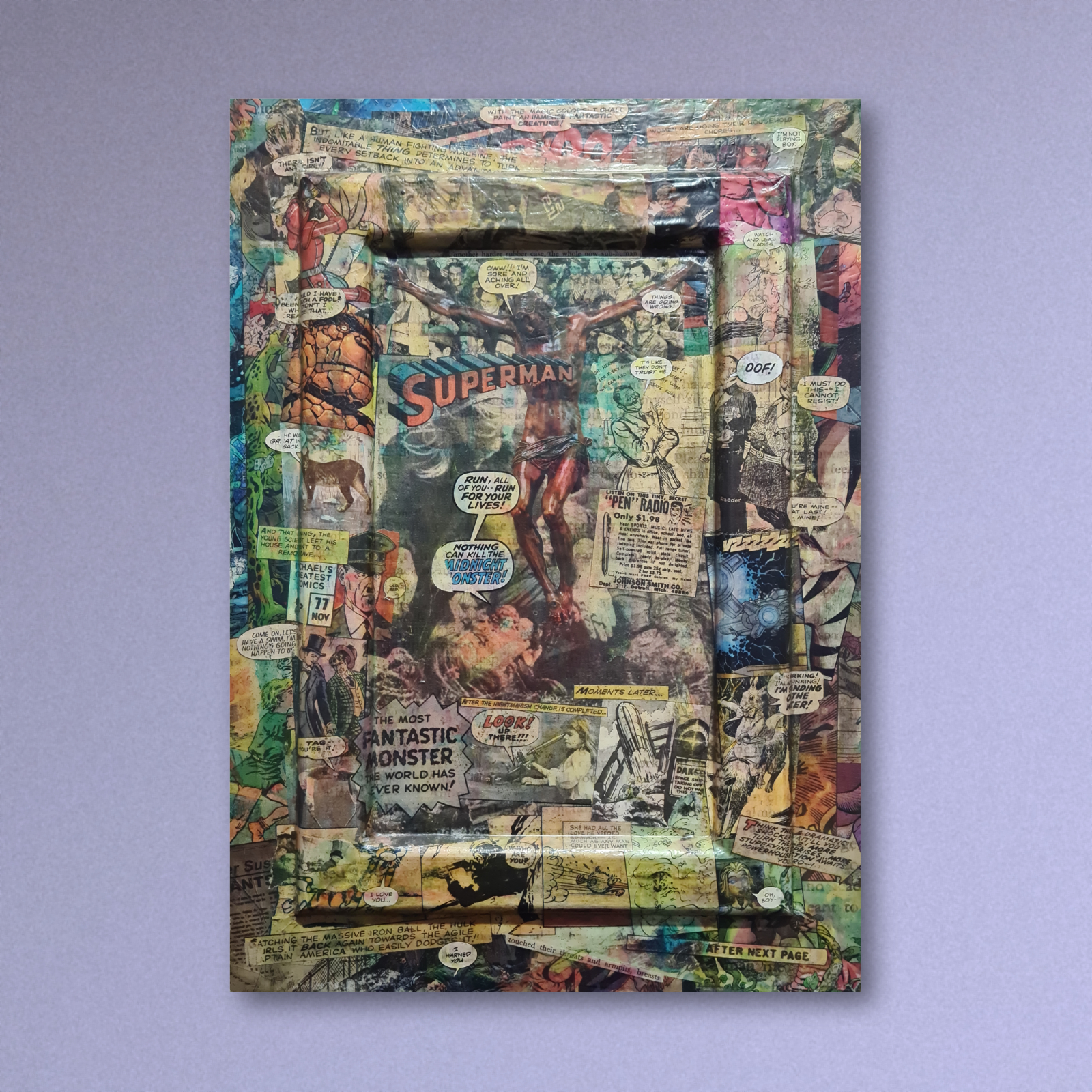 Original paper collage on an MDF panel with wood support and additions. A mix of sources from vintage magazines, papers and comics. Made to last, close to indestructible. Sold to the gentleman with great taste.