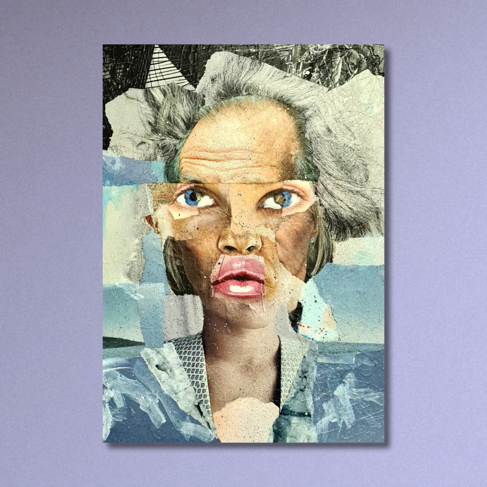 Original paper collage with acrylic paint on a wood panel. A fresh take on a face with recovered parts from previous collages alongside a new attitude to framing shapes and textures.