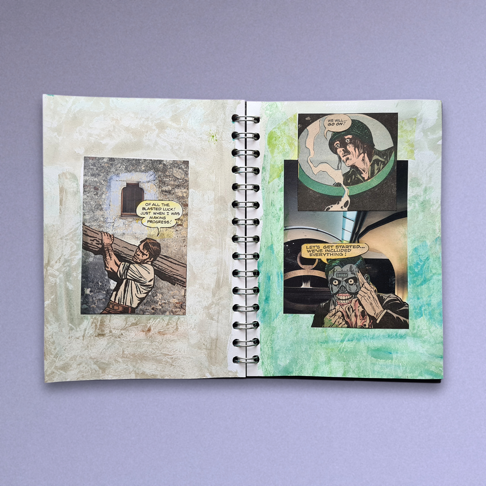 Date: 2022Size: 150 mm / 6 inches [W] × 210 mm / 8.25 inches [H]Original collage within a wire-bound A5 sketchbook. Comic book and magazine and newspaper fragments with acrylic ink washes.Status: 🔴▼