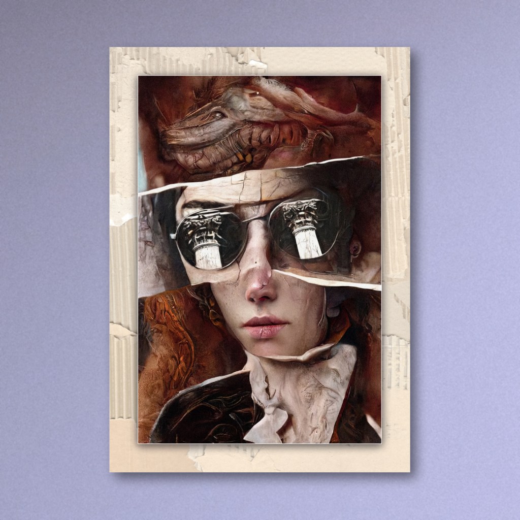 Original paper collage with ai generated digital amends. Printed on 350gsm silk card stock.