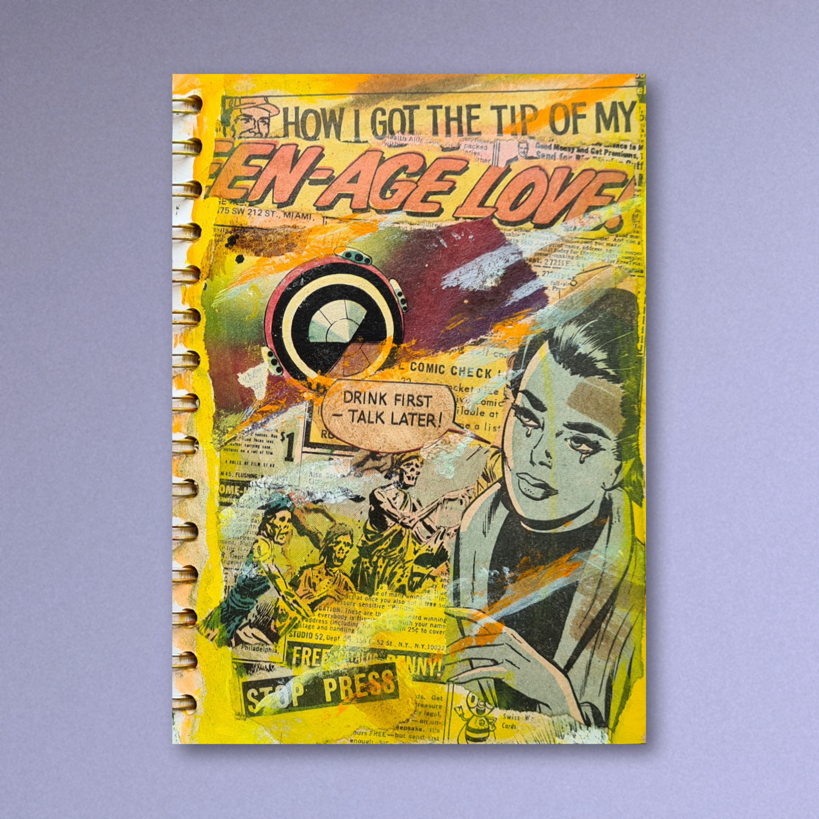 Original collage within a wirebound A5 sketchbook. Comic book fragments and acrylic inks.