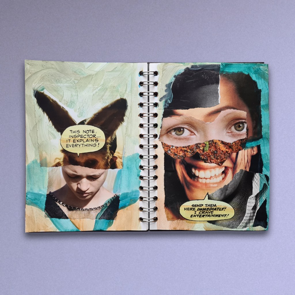 Date: 2022Size: 150 mm / 6 inches [W] × 210 mm / 8.25 inches [H]Original collage within a wire-bound A5 sketchbook. Magazine and comic-book fragments with acrylic ink washes.Status: 🔴▼